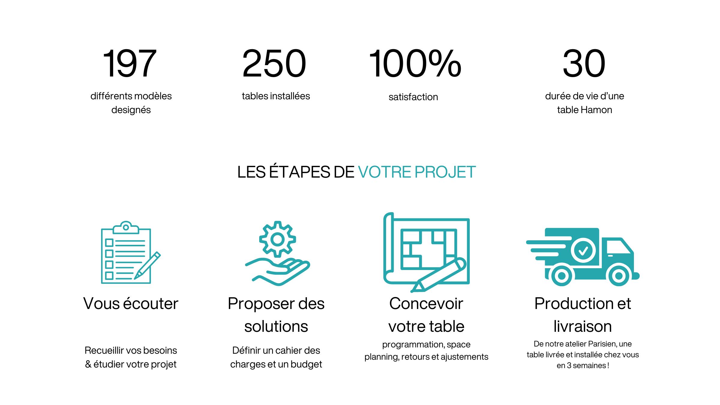 A partir de 2 tables, notre spécialiste HAMON peut se rendre dans votre espace en région parisienne pour vous accompagner dans la création de vos tables. Pour toutes les autres demandes, cette prestation se fait au cas par cas.